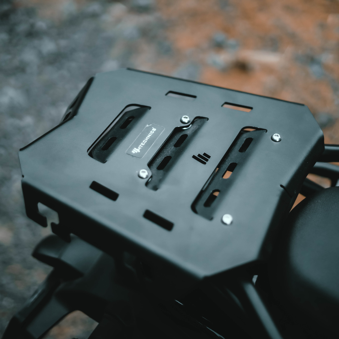 A 3mm MS plate luggage top rack designed to mount top boxes or carry luggage securely during long rides.
